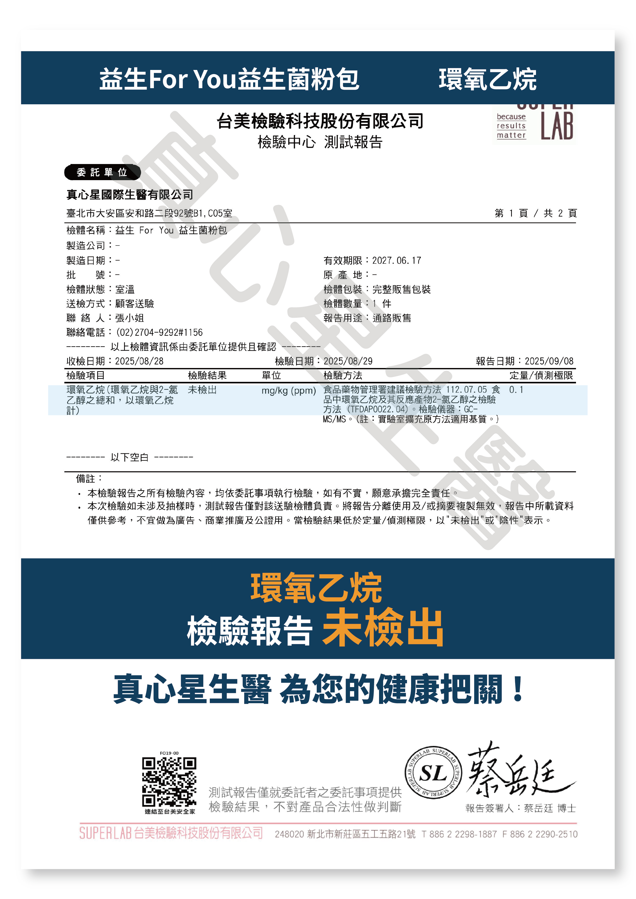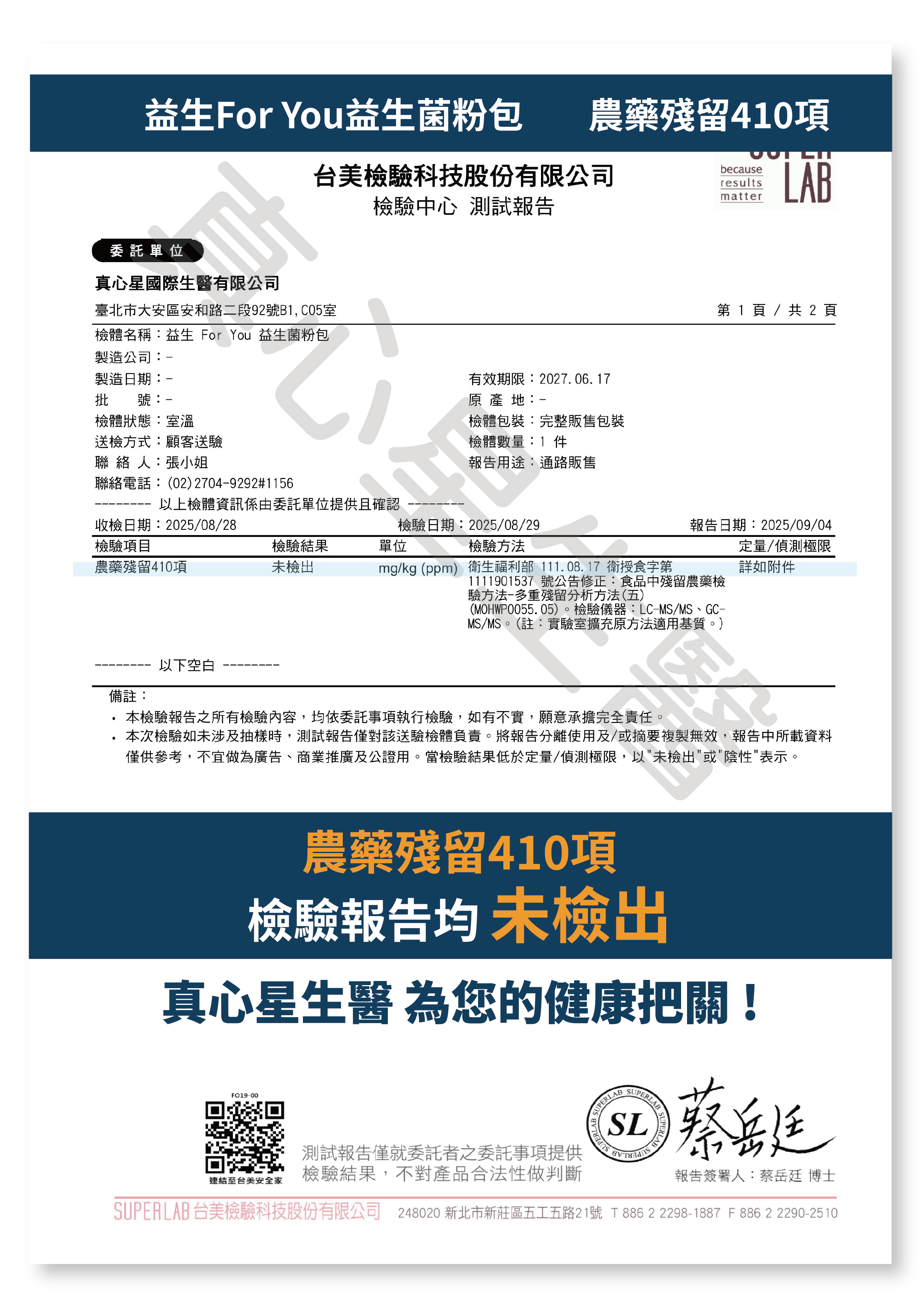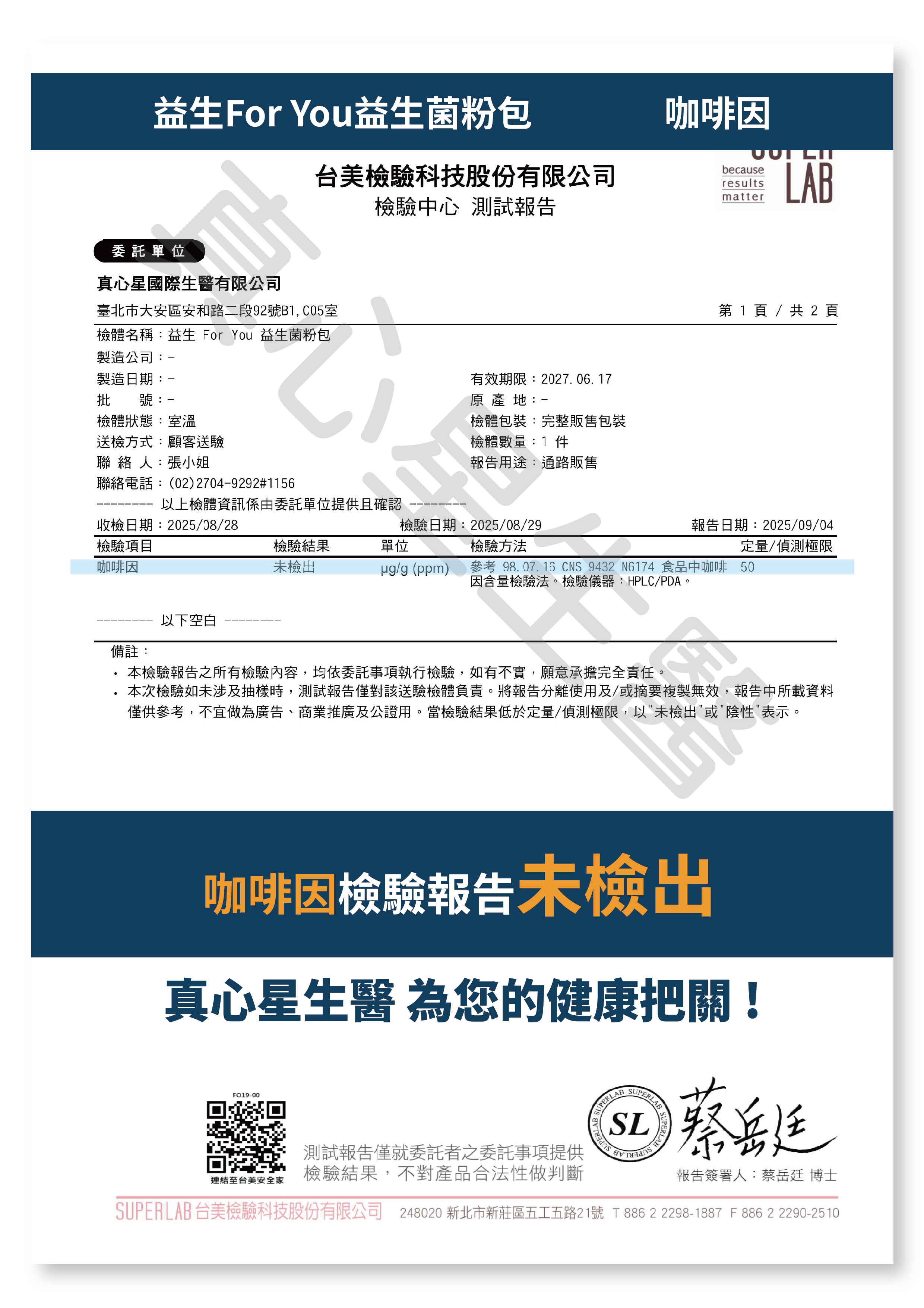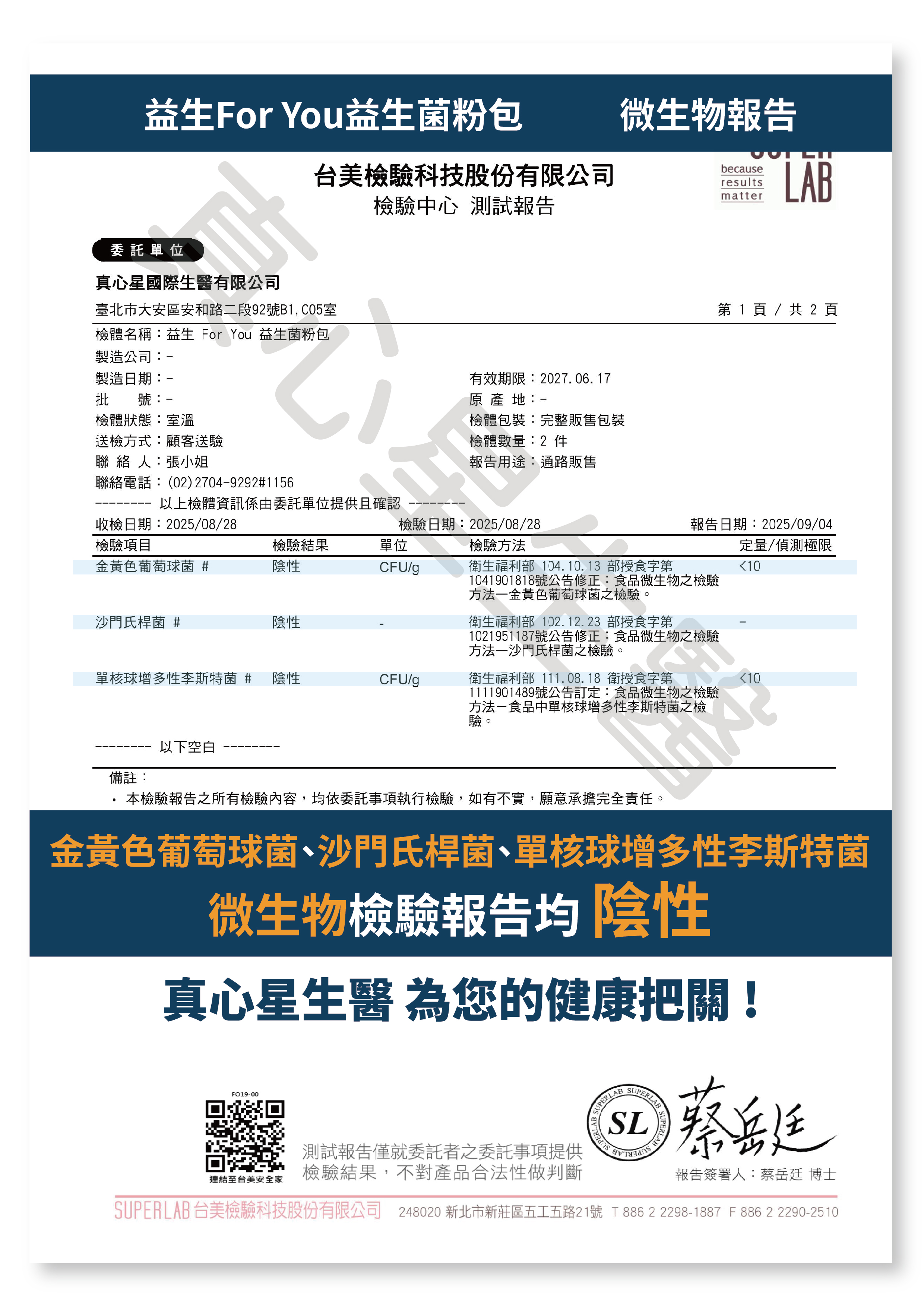 近期我們主動將產品送去第三方公正單位檢驗,結果出爐——每包實際菌數高達2340億CFU!